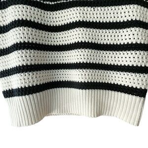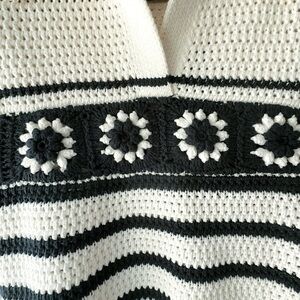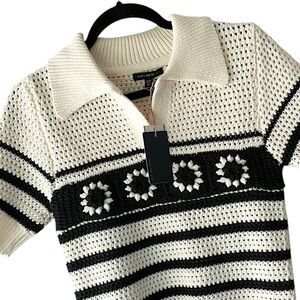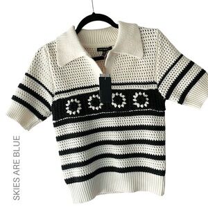NWT | CROCHET STRIPED SPLIT V-NECK COLLARED TOP NAVY BLUE & OFF WHITE | XS
