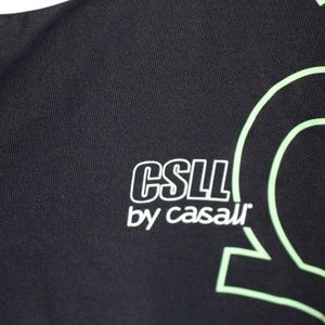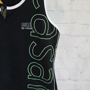 Black racer back with white trim and green "casall" printed down the left side
