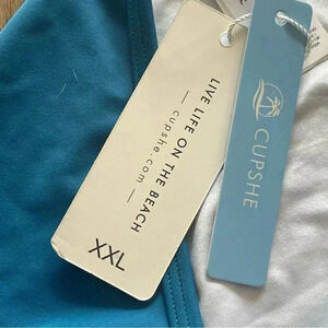 New with Tags Women's Cupshe Bikini Bottoms Size XXL. Teal High Waisted Bottom made of Nylon & Spandex. This listing is for the BOTTOMS Only. Hang Tags attached. Please see pictures for details.