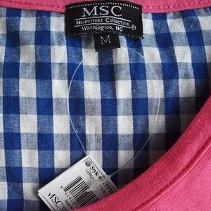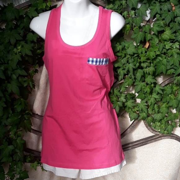 This cute pink and blue and white gingham top is in excellent condition. Never been wore. The gingham is in the back and at the hem of the front pocket. Great top for the summer.