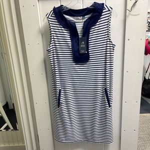 New with tags (NWT) cabana life sleeveless dress with navy and white stripes and fringe around neckline. Ready for any sunny day, this UPF 50+ tunic dress will be your new go-to sleeveless style. Luxurious & lightweight, this shift dress features navy fringe details and a horizontal stripe pattern. Plus, it has pockets!