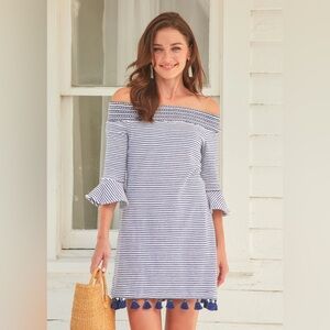 New with tags. Cabana Life. Off the shoulder, terry dress in navy and white stripe.