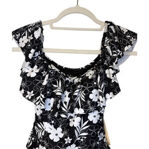 Black & white floral print 1-piece swim suit, size S. Off the shoulder ruffle. Built in bra . New with tags.