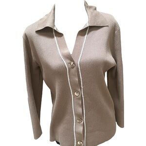 NWOT Cable and Gauge taupe sweater with white detailing with gold buttons . Material is 67% viscose and polyester. Machine wash. Xl