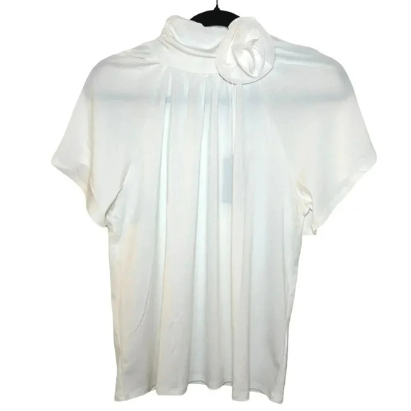 Cable & Gauge short sleeve blouse size large. High neck/ turtleneck neckline with a big beautiful rose off center on the collar. 2 silver buttons on the back of the neck for closure. Fluttering short sleeves in the color Whispering White. This blouse is so pretty and is perfect for under a blazer or a cardigan or even a jean jacket. On its own is fine too. Measurements: length- 23 inches and Chest (underarm to underarm)- 19 inches . 95% polyester and 5% spandex. Brand new with tags!