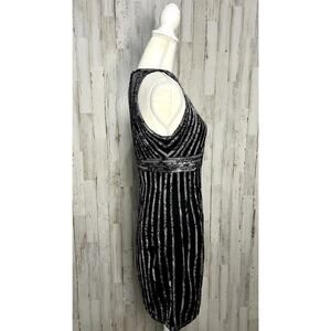 Keywords: Cache dress, size 8 cocktail dress, black sleeveless dress, fitted party dress, knee-length dress, women's elegant dress, sophisticated evening wear, striped pattern dress, polyester cocktail dress, textured fabric dress, round neck dress, women's party attire, new with tags dress, NWT Cache dress, dry clean only dress.