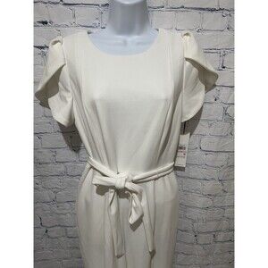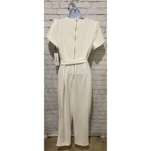 This NWT Calvin Klein cream jumpsuit is a versatile and stylish piece that is perfect for various occasions. The tie waist and gold zipper back add a touch of sophistication, while the short sleeves and one-piece design make it easy to wear. Made from a blend of polyester and spandex, this jumpsuit is comfortable and flattering. The solid ivory color and metal theme make it a standout piece that can be dressed up or down. Ideal for travel, parties, casual outings, formal events, workwear, or business meetings, this jumpsuit is a must-have for any fashion-forward woman. 19 inches pit to pit, 28 inch waist, 27 inch inseam and a total of 53 inches long. Smoke free home.