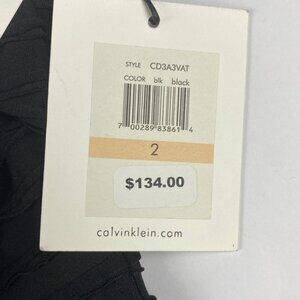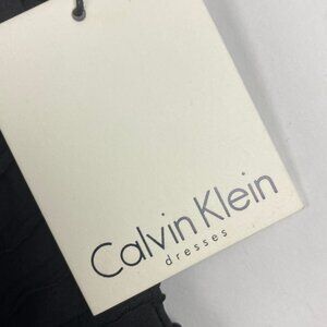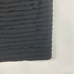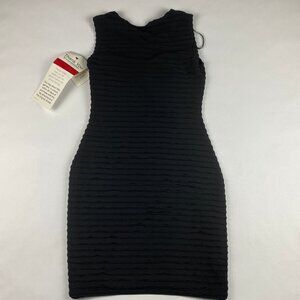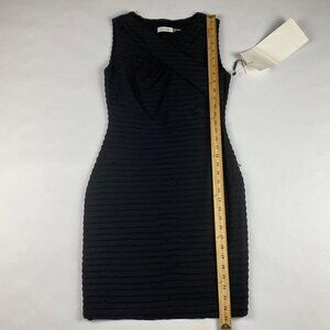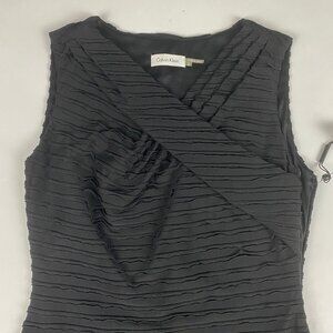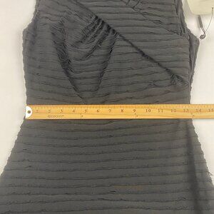 Black sheath dress features textured fabric, side zipper, crossed design neckline.