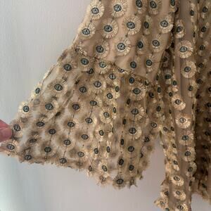 NWT Calvin Klein Embroidered Mesh Top Gold and Peacock Blue Bell Sleeves Size M
