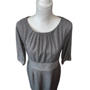 Beautiful black and white herringbone pattern. 3/4 sleeves, gathered neckline, waist band.