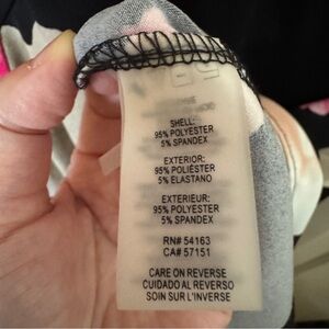 The blouse has a black background with large, stylized floral patterns in shades of pink, white, and beige. It features three-quarter length sleeves and a keyhole opening at the back of the neck.