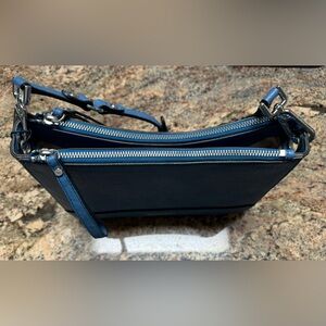 Brand new with tags. Adjustable strap and wrist strap. Blue vegan leather with two zip compartments and middle compartment has a button closure with separate interior zip pocket. Measures approximately 11”x8”x3”.
