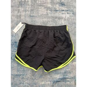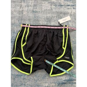Black with neon yellow green accented perforated running shorts. Elastic waistband, pockets, and interior lined panty. Drawstring inside waistband.