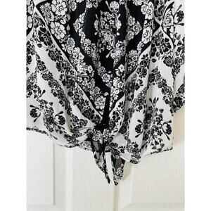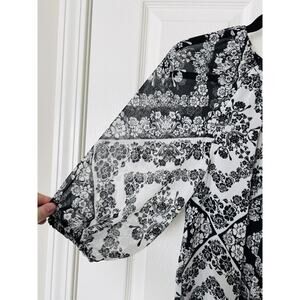 NWT Calvin Klein Scarf Print Chiffon Scoop Neck Bubble Sleeve Tie Front Blouse - Small - Black & White