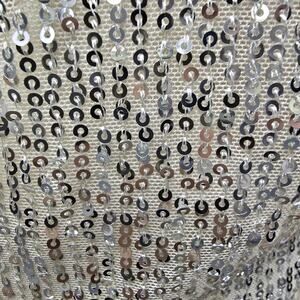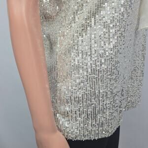 The top is sleeveless and features a high neckline that ties at neck with a long, flowing bow. The sequins cover the entire front and back of the top, creating a sparkly shimmering effect. It has been hand sequined/beaded. It has a button closure at back with a key hole. It is lined.