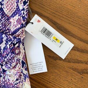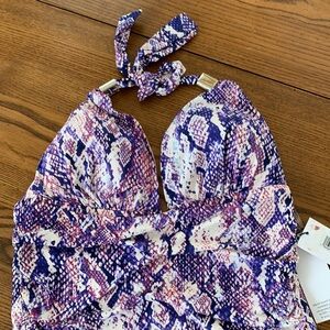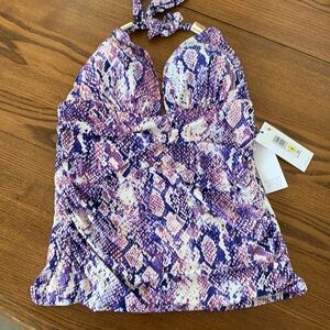 NWT $88 Exotic in a blue/purple snakeskin print, Calvin Klein halter tankini top. V-neckline with rivet hardware detail