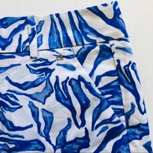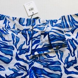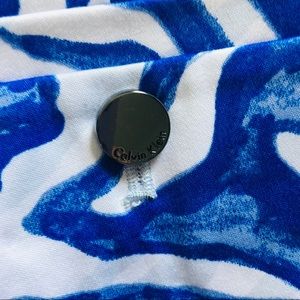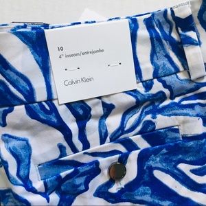 These Blue and white beauties have a front zipper,clips and button closure. Loops for a belt if desired, front pockets with a super metal CK on left pocket Back also has 2 pockets with a metal button with CalvinKlein etched in 4” inseam. 98% cotton 2% spandex. (Pk#157)