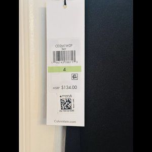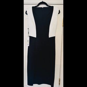Brand new with Tags! Look flawlessly professional with ease in this black and white sheath dress from Calvin Klein, size 4, finished with a modest side slit. This beautiful dress is made from stretchy and supportive scuba crepe with a boat neckline and sheath silhouette. It is lined with a concealed back zipper closure, colorblocked side panels and a slit at the side.