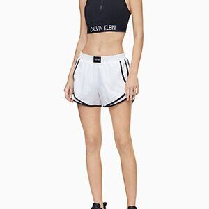 Calvin Klein Women’s XL Performance Logo Patch Piped Mesh Shorts in White with Black Piping.