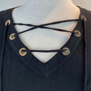 Super stylish lace up top by Calvin Klein featuring gold tone zippers at each cuff and gold tone grommets along the neck line. It measures 20 inches armpit to armpit and 24 inches in length.