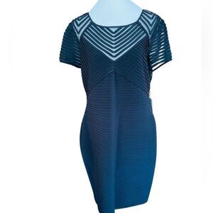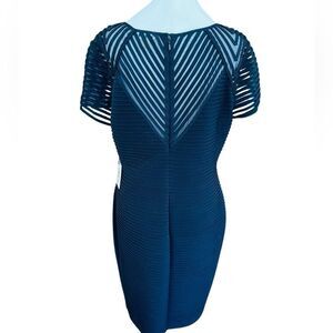 This sheath dress featuring a stunning pin-tuck design for a sleek look and sophisticated look. Semi sheer bodice, sleeves, and deep v back