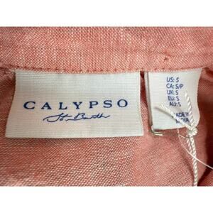 See photos for details — New With Tags! This Calypso St. Barth linen blend shirtdress exudes coastal chic resort style, crafted in a soft coral pink. Designed with a relaxed fit, full button front, collared neckline, and 3/4 length sleeves with button cuffs. Made from a breathable 55% linen / 45% rayon blend, this piece delivers effortless elegance and comfort. Perfect as a lightweight dress or layered as a beach cover-up for vacation-ready versatility.