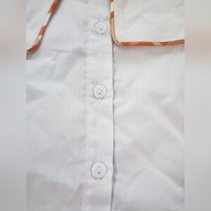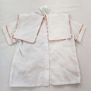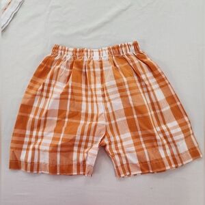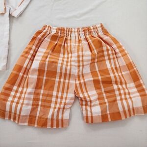 Adorable baby outfit with pumpkin embroidery. Includes a white top featuring inspired sailor collar shirt and orange plaid shorts. BOth never worn. 100% washable. Machine washable. Made in China.