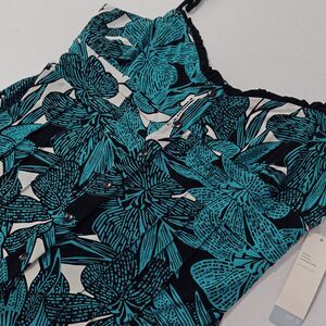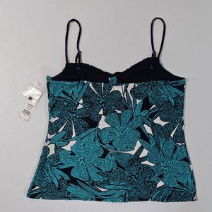 New with tags button front adjustable strap camisole from Apt. 9. New old stock Y2K style. Turquoise and black floral on a white background. Stretchy with an elastic band on the back.