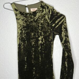 Fully lined. Pull-on stylingBack keyhole with loop button closure. Asymmetric lace-up cutout along back and side. Crushed velvet fabric with dramatic side seam slit.