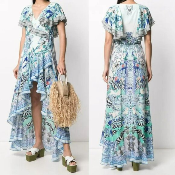 A striking summer maxi dress, the Wings of Luxor Frill Sleeve Long Dress embraces a trippy delve into the mystical world of ancient Egypt. Crafted with a blue and aqua based CAMILLA silk – it features a sweeping high low hem that billows with movement and a feminine cross over ruffle hem that falls from a v-neckline, while hand applied crystal embellishments adorn its bodice frills and an internal tie closure lends to a fitted shape. Wear to summer soirees or formal events with statement heels. As seen on Bethenny Frankel and Judy Gemstone of The Righteous Gemstones. 100% silk. New with tags!