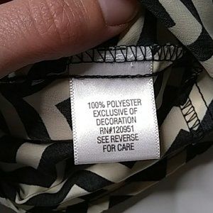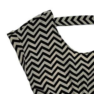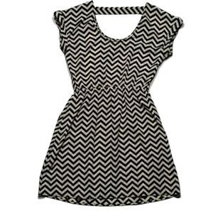 Black chevron printed bar back dress by Candie's. Cuffed cap sleeves, pockets, elastic waist, scoop neck, scoop open back with bar accent across top. New with tags. Black chevron print on creamy background. Approx measurements: bust 17", waist 12"-16" with elastic, length 32", all approximately taken while flat.