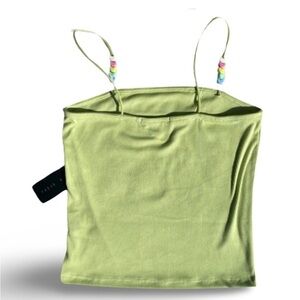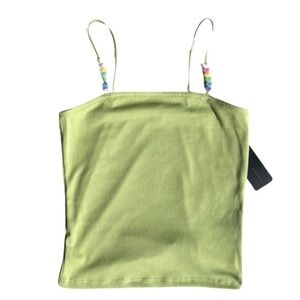 Introducing the vibrant and playful Junior Large Lime Neon Light Green spaghetti strapped top made by FADED ROSE. This eye-catching piece is perfect for those who love to stand out. With candy-colored hearts that slide to either side on the front or back straps, this top exudes a fun and unique charm. The top is brand new with tags, ensuring its pristine condition. Embrace your individuality and make a statement with this stunning FADED ROSE creation.