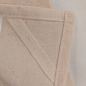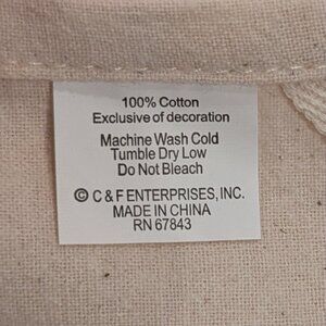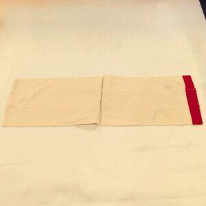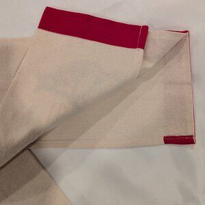 The towel is made of 100% cotton flour-sack material. The entire bottom hem of the towel has a wide contrast trim in red, which looks like a ribbon, but is actually another fabric sewn on top of the flour-sack material.