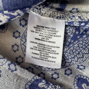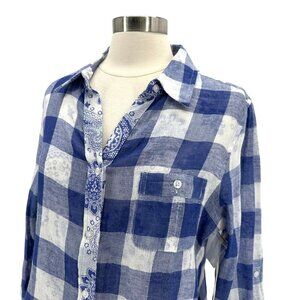 Description: NWT Caribbean Joe Deep Surf Checker Blue White Button Shirt Top Women's Size Large - Long sleeve collared button down shirt with a blue & white checkered pattern. Inside has a paisley & floral pattern. Fabric is semi-sheer. 1 front pocket. Long roll-tab sleeves. Made of a lightweight woven fabric. 100% Cotton. Made in India.