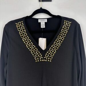 NWT Carmen Marc Valvo Women's V Neck Studded Tunic Blouse Black Gold Size Large
