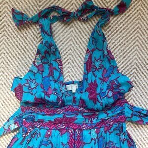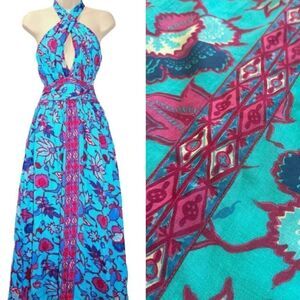 NWT Caroline Constas Criss Cross Halter Floral Maxi Cotton Dress Size M Turquois