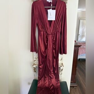 Chic maroon dress with a flattering V-neckline. Ideal for special occasions. Deep V neck. Flirty slinky metallic dress.