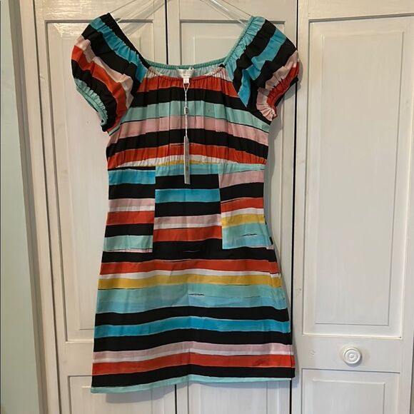 Caroline Costas Calla Mini Dress. Bright stripes with a watercolor edge.