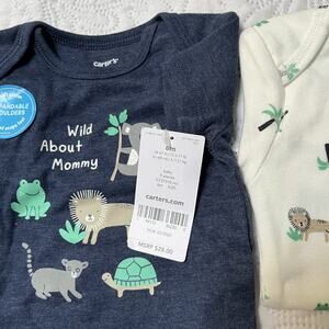New with tags Carter's onesie bundle. Includes 5 one piece bodysuits with expandable shoulders and reinforced snaps in animals, stripes and Wild about Mommy word print. Size 6 months.