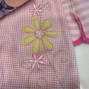 BRAND NEW with tags. Two pieces. Pink cotton full zip hoodie with pink & white stripes inside the hoodie. Onesie is long sleeves pink & white check with embroidered flowers. Size 6-9 months. See photos for measurements