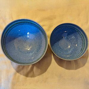 This is a SET of 4 nesting bowls, made of fine stoneware in Portugal. The brand is Casafina. These bowls have a beautiful blue glaze that was inspired by the shades of the Atlantic Ocean. (NOTE: The glaze on each bowl is slightly different. Also, the photos make it look like the bowls have some shadows on their upper-left sides, but that was just the lighting when I took the pictures.) The bowls can be used for eating, serving food, or just for display. They are dishwasher, oven, freezer and microwave-safe. Casafina logo on the bottom of each bowl. (NOTE: There are no ridges on the bowls -- the sides are smooth. The stripes are just part of the glaze.) The smallest bowl has a 5-inch diameter and is 2.5 inches high. The second-smallest bowl has a 7-inch diameter and is 3.5 inches high. The second-largest bowl has a 8.5-inch diameter and is 4.5 inches high. The largest bowl has a 10.5-inch diameter and is 5 inches high. The 4 bowls together weigh approximately 8.5 lbs. Due to its weight, this package will incur an additional shipping cost of about $20, so the price reflects that. Will ship in a Casafina-branded cardboard box (not a fancy box, just a shipping carton). The bowls can also be sold separately; contact me if you're interested in just 1 or 2 of them.