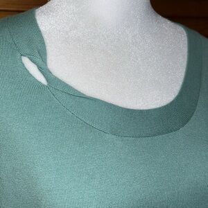 This casual corner sweater in a beautiful green has an accent twist at the collar. This sweater is new with tags and in perfect condition lightweight and perfect for the upcoming Spring season. Super soft with a delicate ribbed accent at the hemline and also cuffing the sleeves.