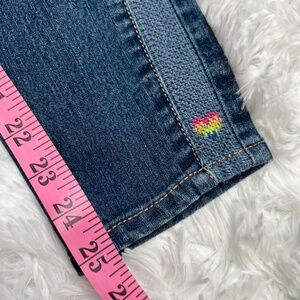 BRAND NEW- These are super cute!! This blue denim jeans has the cutest cross-stitching hearts going down the outside of the leg. The design is colorful and is sure to make matching something already in her closet a snap. Length measurement shown in pics.#5-6.