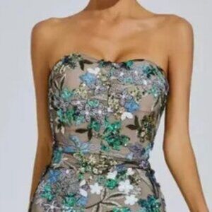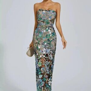 NWT Catchall Leanna Blue Flower Sequin Embroidered Strapless Maxi Dress. SZ L
