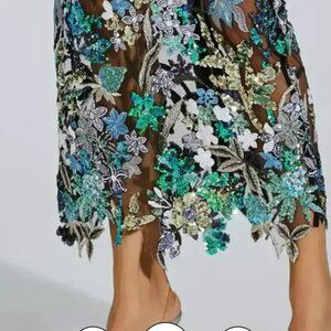 The Leanna Blue Flower Embroidered Maxi Dress by Catchall - absolutely stunning strapless dress with a sweetheart neckline in black mesh over a nude lining with embroidery throughout the exterior that’s richly embellished with a floral sequin pattern, predominately done in shades of blue, green, and gold. Exposed back zip closure, and an internal support. Size L. New with tags.