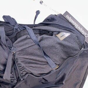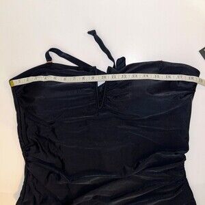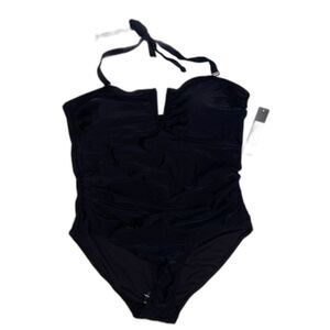 New with tags Convertible Strap One-Piece V Wire Shirred Bandeau one piece swimsuit by Catherine Malandrino in black. The choice is yours with the removable straps that allow you to wear this bandeau style or as a halter. Brand new with tags, v-neckline with built in wire, built in bra cups, fully lined, nylon and spandex. Women's plus size 2X with measurements pictured.