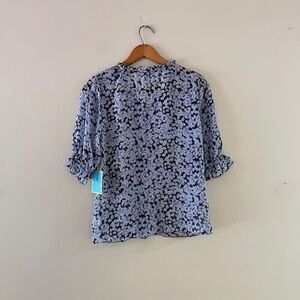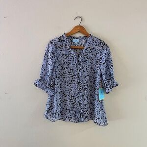 " A ruffled trim brings frill to a floral patterned blouse for effortless style in your wardrobe." Great sheer floral blouse can be dressed up or down. ruffle detail, button front. Size small with approximate measurements laying flat of 19" chest and 24" length. In excellent condition from a smoke-free, dog friendly home.