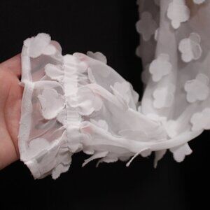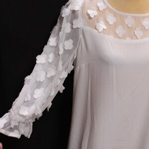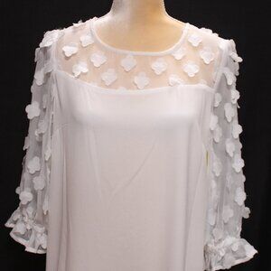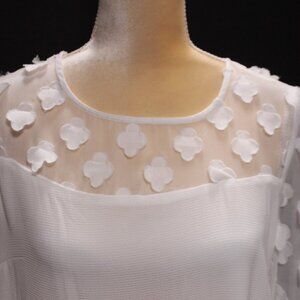 Stay ahead of the fashion game wearing the CeCe Long Sleeve Mixed Media Clover Clip Dress that features little floral appliques on the neck, shoulders, and sleeves. New With Tags, 100% Polyester, Size Small, Ivory White