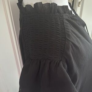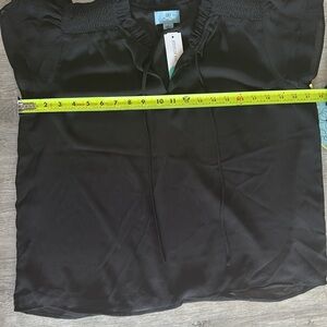 This CeCe black short sleeve blouse in size large is new with tags and perfect for business casual settings. It features a sheer outer layer with a built-in lining for coverage, giving it a polished and lightweight feel. The smocked neckline with a tie detail adds a soft, feminine touch, while the 100% polyester fabric has a smooth, flowy drape. A great option for work, dinner, or any occasion where you want to look put together without being too formal.