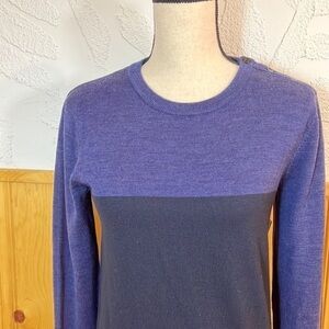 New color block sweater in navy and black. It’s 100% wool and is machine washable. There is a 3 button detail on the left shoulder. It has a crew neckline and ribbing on the cuffs and waist. Approximate measurements laying flat: bust 18” across from armpit to armpit, sleeve length 25” and length 25”.